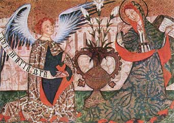 de lis; beside it, a stem of lilies growing just below the Virgin. The