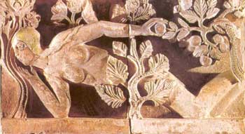 her way through a thicket of "bushes." The bush on the right is the Tree of