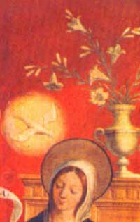 de lis; beside it, a stem of lilies growing just below the Virgin. The