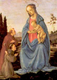 prayer before the Virgin; Anthony holds a stem of lilies that rests on the