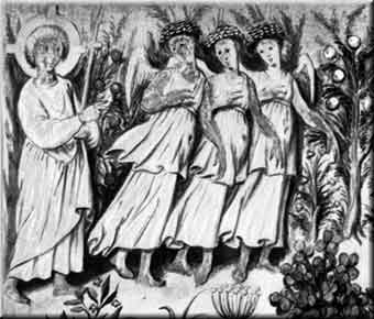 Lord pointing to three angels with mushroom caps.